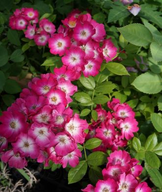 Цветки немахровые, малиновые с белым центром, оттеняются ярко-желтыми тычинками. Они мелкие, но появляются в крупных кистях. Цветки сохраняют окраску и долго держатся, после них обычно созревают мелкие красные плоды. Листва ярко-зеленая, тонкая, блестящая. Куст ветвистый, все время выпускает новые цветоносные побеги, его можно пустить виться по стене, как плетистую розу. Довольно устойчив к болезням. Цветет без устали. В жарком климате при посадке следует избегать участков, где розы все время будут находиться на жарком солнце.