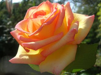 Цветки желтые, с яркой малиново-красной каймой, переход цвета сочетается мягко и изящно, и цветок выглядит очень нежным. Цветки с высоким центром, классической формы чайно-гибридной розы. Цветет в течение всего сезона с небольшим перерывом. Сорт неприхотлив в уходе.