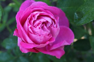 Цветки густо-розовые, с сиреневым отливом и серебристой оборотной стороной лепестков. Шаровидные бутоны раскрываются в огромные чашевидные цветки, густомахровые, с волнистыми лепестками, как пионы. Цветки крепко держатся на сильных побегах, не поникают, появляются обычно по одному, иногда по 2-3 шт. Листва средне-зеленая, матовая. Хорошо черенкуется. Из душистых лепестков варят варенье.
