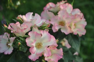 Цветки из 4-8 лепестков кремового цвета с розовым, волнистым краем, собраны в многочисленные соцветия. Куст прямостоячий, густой, с темной, матовой листвой, цветки устойчивы к дождю. Эффектное, обильное цветение.
