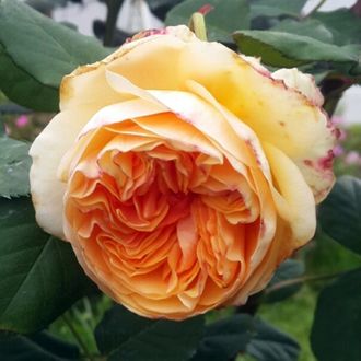 Крупные абрикосовые цветки старинной формы, иногда квартированные, в полном роспуске слегка выгорают, в соцветиях. Листва матовая, средне-зеленая