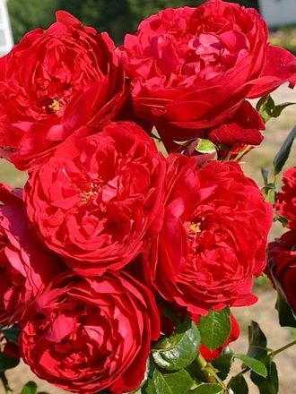 Ярко-красные цветки с желтым глазком, розетковидной формы, густомахровые, обладают легким фруктово-цветочным ароматом. Цветение очень обильное. Растение сильнорослое, лист темно-зеленый, глянцевый, плотный.
