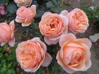 Абрикосовый, густо-махровый, чашевидный цветок. Края аккуратно уложенных лепестков более светлого оттенка, чем серединка. Цветки собраны в кисти, в период массового цветения - до 7 штук. Легкий, приятный аромат. Цветение обильное и продолжительное. Цветок долго не теряет привлекательность и в вазе, и в саду.