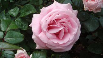 Цветки нежно-розовые, со слегка более темной изнанкой. Появляются обычно по одному, иногда в кистях. Аромат очень насыщенный, напоминает старинные дамасские розы. Куст сильнорослый, прямостоячий, с ярко-зеленой, устойчивой к болезням листвой.
