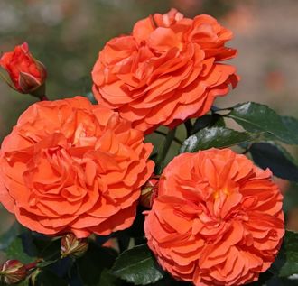 Цветки махровые, ностальгической формы, насыщенно оранжевые, прочные. Цветение повторное. Листва полностью устойчива к чёрной пятнистости и мучнистой росе.