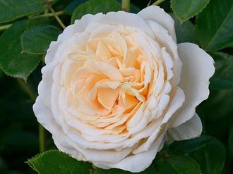 Густомахровые, умеренно душистые цветки этой розы можно назвать «кремовыми плюс», потому что сквозь общий тон проступает бледно-желтая, а иногда нежно-розовая дымка. Обильно ветвящийся куст с темно-зелеными листьями цветет все лето и осень.