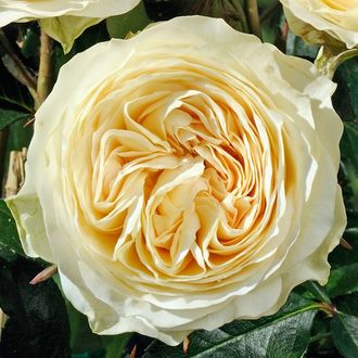 Густо-махровые цветки старомодной формы нежных оттенков шампанского с мягким свечением в центре.