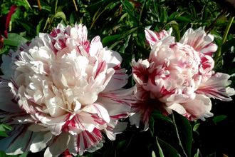 Красивый и необычный пион. Цветок махровый, белый с яркими малиновыми штрихами. Бутоны красные. Куст крепкий, стеблей много и они сильные, хорошо держат цветки. Высота куста 80-100 см. Срок цветения средне-поздний.