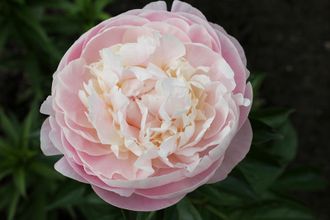 Цветок махровый розовидный, белый с розовым оттенком, кремово-желтый отблеск внутри, позднее белеет. Размер цветка 20см. Цветок замечательно сложен. Наружные лепестки крупные, загибаясь внутрь, образуют бутон. Куст стройный, красивый, многостебельный. Высота 90см. Листья крупные, тёмно-зелёные с вдавленными жилками. Стебли прочные. Надежный, обильно цветущий, хорошо растущий сорт. Легкий аромат. Средний срок цветения.