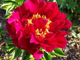 Кусты средней высоты (около 90 см), с прямостоячими крепкими побегами, усыпаны листвой средне-зеленого цвета. Цветы махровые, объемные, розовидной формы, достаточно крупные, диаметром 20 см. Они темно-красные, выглядят очень эстетично, имеют вогнутые бархатистые лепестки и яркие золотистые тычинки. Источают сладкий аромат средней интенсивности.