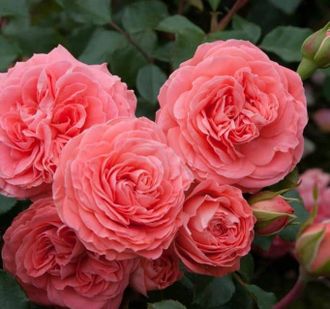 Густомахровые лососево-розовые или оранжево-розовые цветки собраны в кисти над блестящей темно-зеленой листвой. Цветет практически непрерывно. Очень интересное и неожиданное сочетание небольшого, ветвистого, густого кустика и довольно крупных цветов с каким-то благородным, старинным шармом на слегка поникающих цветоносах. Не менее интересно изменение формы и цвета цветка с возрастом до неузнаваемости. В полуроспуске цветы глубоко чашевидные, с плотно закрученной серединкой, насыщенного, сияющего лососевого цвета. Полностью раскрываясь, становятся розетковидными, черепитчатого сложения, к отцветанию выгорают до серебристо- бледнорозовых. Цветок держится бесконечно долго. Дождя не боится, к болезням не расположена. Хороша на переднем плане.