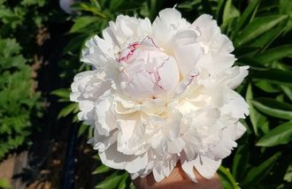 Краснова, 1969, СССР. Форма махровая розовидная, скорее плоская. Огромный , белый пион, цветок с красными мазками на центральных лепестках. Куст раскидистый, 90см., стебли зеленые , листья темно зеленые , с темноокрашенными черешками. Средний срок цветения .Быстро нарастает.
