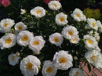 Полумахровый. Цветок лёгкий, воздушный, белый, при роспуске розовеющий, диаметром 25 см. В центре золотистые тычинки. Высота 80 см. Высококачественный пион для сада и срезки. Ранне-среднего срока цветения. Распускается со светло-розовыми внешними петалодиями, потом становится чисто белым. Тычинки желтые. В сезон дождей иногда в центре цветка появляются дополнительные белые лепестки. Куст полушаровидный, крепкий с прочными стеблями. Сорт ароматный, цветение обильное и продолжительное. Разрастается быстро . Золотые медали Американских выставок 1956г.