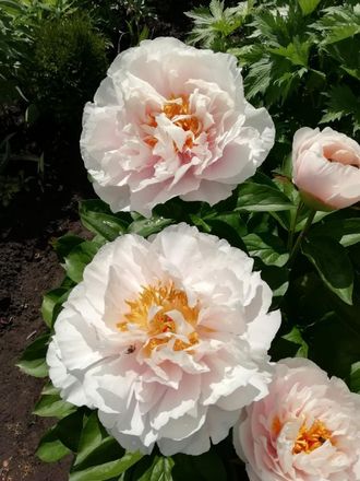 Нежно-розовый по краям, переходящий к чуть более темному в центре бутона. Обладает нежным розовым румянцем. ”Краснеющая Принцесса” . Практически махровый цветок изысканного румяного оттенка. Хорошо набирает объем ,очень пышный , красиво сложен , подсвет в центе цветка легкий, розово-лиловый. Диаметр 18см. Стебли очень прочные, толстые, никогда не полегают. Огромные листья средне-зеленого цвета. Высота куста 80-85см. Бархатистый, изогнутые лепестки создают удивительную структуру бутона. Замечательный декоративный сорт.