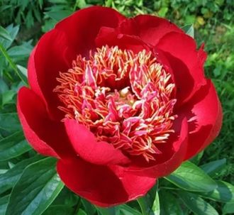 Гибрид. Цветок японской формы диаметром 17см, Насыщенный красно-вишневый цветок, стаминодии той же окраски, но с желтыми краями. Куст компактный, стебли прочные. Аромат легкий свежий. Куст , высотой 80см.. ЗОЛОТАЯ МЕДАЛЬ 1974 г. Срок цветения средне-ранний.