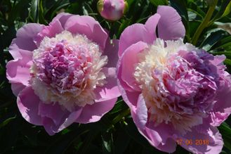 Махровый бомбовидный. Цветок диаметром до 20 см. Пион густо махровый, шелковистый, лососево-розовый, великолепный цветок. Окраска внутренних лепестков варьирует между белой, нежно-розовой и кремовой. Внешние лепестки более широкие, розовые. Аромат замечательный. Высота 90см. Стебли сильные. Средний срок цветения.