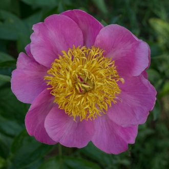 Гибрид. Простой. Цветок диаметром 17-18 см, малиново-розовый, светлее на краях лепестков. Лепестки округлые. В центре большое кольцо из длинных золотистых тычинок. Листва густая. Цветение обильное, в ранние сроки. Высота 100-110 см.
