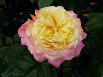 Густомахровые цветки, с плотно набитой серединкой – желтые, с ярко-розовыми или красными кроющими лепестками. Интенсивный аромат с нотками ванили, гелиотропа и жасмина. Куст высокий, прямостоячий, с крепкими побегами.